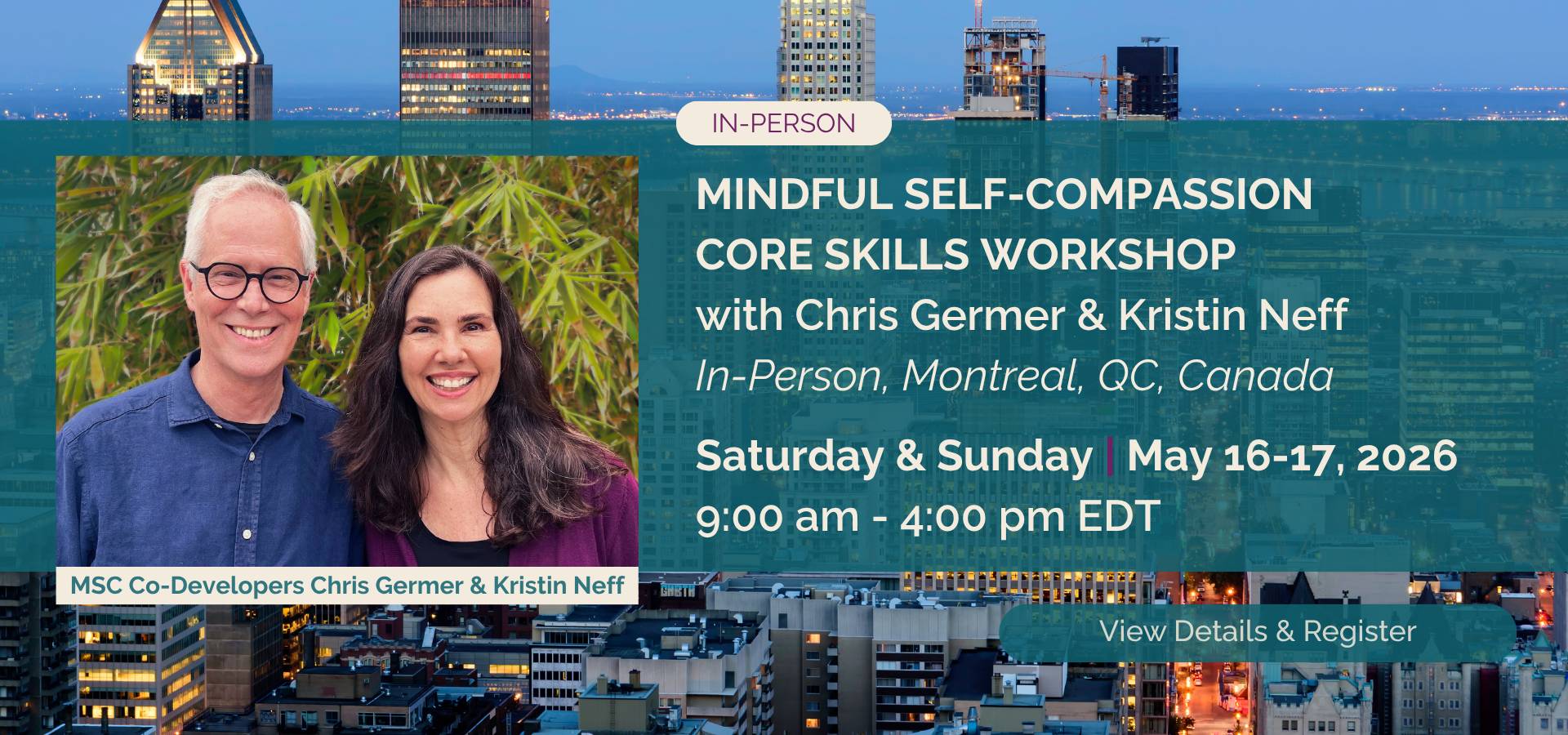 Join MSC coâfounders Dr. Kristin Neff and Dr. Chris Germer this May in MontrĂŠal for a rare, immersive inâperson MSC Core Skills Workshopâa special opportunity to learn directly from the pioneers who developed the Mindful SelfâCompassion program.